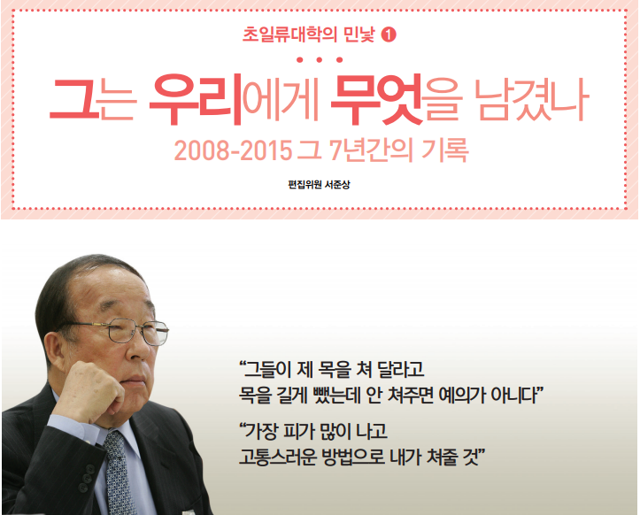 https://cauculture.net/181[특집1: 초일류대학의 민낯]그는 우리에게 무엇을 남겼나 ― 2008-2015 그 7년간의 기록 편집위원 서준상 뿌린 대로 거두다 표현부터가 예사롭지 않은 이 문장들은, 3월 24일 박용성 전 이사장이 이용구 총장과 보직교수 등 20여 명에게 보낸 메일 중 일부를 발췌한 것이다. 그는 구조조정을 반대하는 비대위 교수들을 가리켜 ‘Bidet委(비데위)’ 또는 ‘鳥頭(조두, 즉 새대가리)’라고 표현했으며, “그들을 악질 노조로 생각하며 대응해야“하며 “그들을 꽃가마에 태워 복귀시키고 편안한 노후를 보내게 해 줄 생각은 눈곱만큼도 없음을 중앙대 인사권자로서 분명히 한다”고 밝혔다. 그의 막말은 여기서 그치지 않았다. 중앙대 구조조정에 반대하는 타 대학 인문대 학생회장 방문에 대응하여 박 전 이사장은 25일 재단 임원들에게 총학생회 이름으로 ‘3류인 너희 대학이나 개혁해라 우리는 개혁으로 초일류가 되련다’..cauculture.net무려 초일류대학ㅋㅋㅋㅋㅋㅋㅋㅋㅋhttps://n.news.naver.com/mnews/article/374/0000394523?sid=101'날강도' 소리 듣던 두산 사업재편…결국 금감원 제동 두산그룹의 사업 재편 행보에 제동이 걸렸습니다. 소액주주들의 거센 반발을 받고 있던 합병 신고를 금융감독원이 반려했습니다. 조슬기 기자, 금감원이 문제삼은 부분이 뭐였습니까? [기자] 금감원은 어제(24일) 두산로보n.news.naver.com두산 막장 행보에 금감원 출동ㅋㅋㅋㅋㅋ