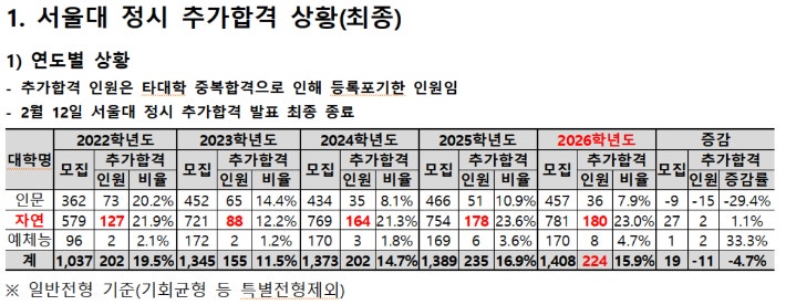 서울대 전체 등록포기자, 총 224명…모집인원의 15.9%
