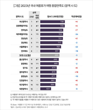 https://www.gukjenews.com/news/articleView.html?idxno=2832728 여름휴가지 만족도 부산 1위, 강원 2위…제주도는? ‣ 강원도, 부산과 1점 차이 2위…전남, 4계단 껑충 3위‣ 7년간 부동의 1위이던 제주도는 단번에 4위로 밀려나‣ '물가∙상도의' 부정적 평가가 2년 연속 급락 이끌어(부산=국제뉴스) 김옥빈 기자 = 부산이 올해 처음으로 여름휴가지 만족도 1위를 차지했다. 2016년 조사 시작 이래, 부동의 1위이던 제주도는 강원, 전남에도 밀리며 4위로 내려 앉았다.여행 리서치 전문기관 '컨슈머인사이트'가 2016년부터 매년 9월 2만 5000명 이상을 대상으로 수행하는 '연례 여름휴가 여행 만족도 조사'에서 올해 1박 이상 국내 여름휴가(6www.gukjenews.com