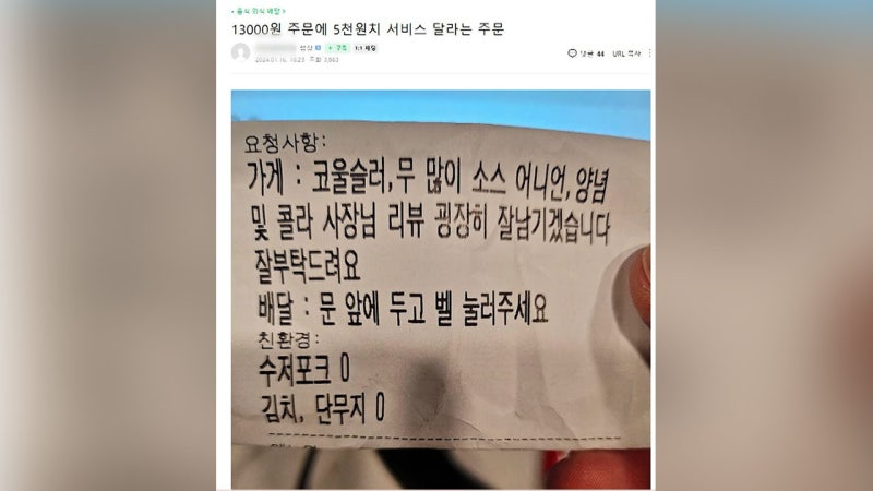 https://n.news.naver.com/article/055/0001123620?sid=102[뉴스딱] 1만 원대 주문에 이벤트 금액만 '5천 원'…주문 취소하자요즘 배달앱을 사용하면 리뷰 이벤트 적는 분들 많으실 겁니다. 그런데 가게 '리뷰 이벤트'에 과한 서비스를 요구한 고객의 사연이 전해지면서 의견이 분분합니다. 자영업자 온라인 커뮤니티에는 치킨집을 운영한다는 A 씨의n.news.naver.com뿜거지행님들 요즘도 여전하시네 ㄷㄷ