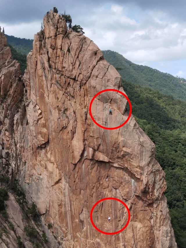 ◇지난 28일 오후 1시30분께 설악산 비선대 근처 적벽에 사람이 매달려 있다는 신고가 접수됐다. 환동해특수대응단 산악구조대는 100m 높이의 설악산 적벽에서 지상으로부터 약 30m 높이에 고립돼 있는 A(37)씨와 B(25)씨를 발견해 3시간여만에 구조에 성공했다. 이들은 신고 절차를 어긴 채 설악산 적벽을 등반하다가 사고를 당했다. 사진=환동해특수대응단 제공