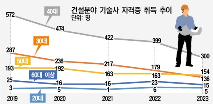 뉴스 기사에 수록된 말임https://m.dnews.co.kr/m_home/view.jsp?idxno=202402291638022410076‘씨’마르는 건설 분야 기술사…자격증 취득 5년새 ‘반토막’지난해 토목 등 신규 기술사 610명30대 52.6% 감소…20대 안 보여전문인력 부족 현장 혼란 불가피그래픽: 이인식기자 fever@[대한경제=서용원 기자]건설 분야 신규 기술사 유입량이 지속적으로 줄고 있다. 최근 5년 사이 건설 분야 기술사 자격증 취득자는 절반 ...m.dnews.co.kr