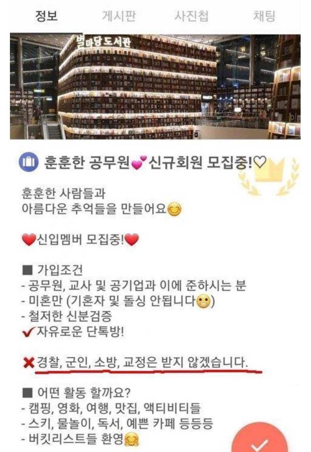 뭐 교는 뺀다쳐도 저 이유때문에 안받는거 맞음 애초에 동호회하는게 여자만나려고 하는건데 결혼적령기 나이대에서 순소는 걍 사기급 매물임. 기본적으로 키크고 몸좋고 공부만 하다 온 애들도 아니라 최소 외모에서 찐따티는 안나고 놀줄도 앎. 벌이도 대기업 전문직급은 아니지만 나쁘지않은데 거기다 안정적이기까지함. 걍 범생이 찐따들이랑 동일 경쟁선상이 아님