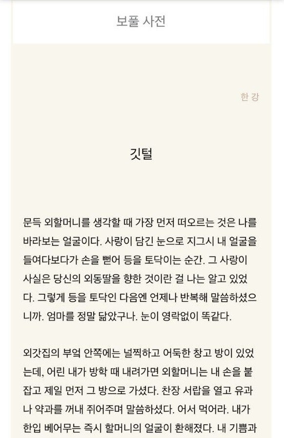 번역웅앵은 그저 젖가슴문학 변명이였긔https://naver.me/FUhOtNTQ[단독] “심장 속 어둑한 방에…” 한강, 노벨상 수상 뒤 첫 글15일 저녁 9시 온라인 무크지 ‘보풀 사전’에 한강 작가의 ‘깃털’이라는 글이 올라왔다. ‘보풀 사전’은 한강 작가가 이햇빛, 전명은, 최희승 작가와 함께 만드는 온라인 무크지로 구독을 신청하면 네 작가가 쓴 글을naver.me