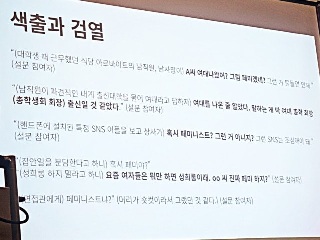 https://n.news.naver.com/article/002/0002358442?sid=102'집안일 분담해요' 말하자 "혹시 페미?"…한국사회 지배한 '페미니즘 사상검증'페미니즘 연구자들 "페미니즘 사상검증, 여성노동자 '심리적 해고상태' 빠트렸다" 수많은 여성 노동자들이 페미니스트들에 대한 백래시(반발)로 인해 직장 안팎으로 괴롭힘을 당하고 있는 가운데, 한국 사회를 지배하고 있는n.news.naver.com