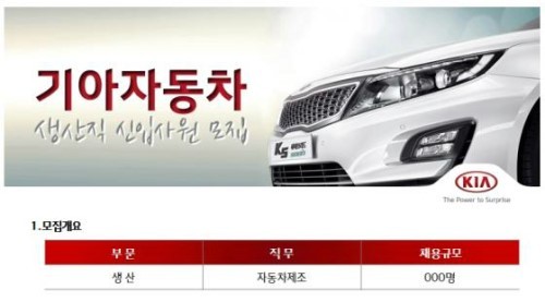 기아자동차는 기아차 채용포털(recruit.kia.co.kr)를 통해 오는 14일까지 기아자동차 생산직 신입사원을 모집한다. 모집 부문은 생산이며 직무는 자동차 제조 채용 규모는 000명이다. 기아차 채용 지원 자격은 고등학교 졸업 이상 전문대 졸업 이하, 또는 이와 동등한 학력 소지자, 남자의 경우 병역 의무를 필하거나 면제된 자, 기타 해외여행에 결격사유가 없는 자이다. 1차 서류전형 합격자에 한해 2차 전형이 실시되며 증빙서류는 2차 전형일에 제출해야 한다.