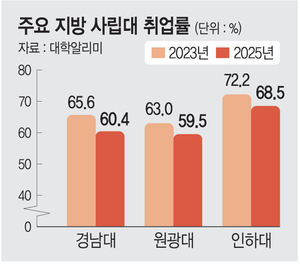 그러나 문화일보가 올해 등록금 인상을 결정한 사립대의 취업률·전임교원 확보율(대학알리미) 등을 분석한 결과, 이들 대학의 경쟁력은 오히려 떨어지고 있는 것으로 파악됐다. 조선대의 경우, 2023년 59.8%였던 취업률이 2024년 57.8%, 지난해 56.6%로 하락했다. 같은 기간 인하대(72.2→71.5→68.5%), 원광대(63.0→62.6→59.5%), 경남대(65.6→61.2→60.4%) 등도 취업률이 떨어졌다. 전임교원 확보율(학생 정원 기준) 역시 동신대(2024년 70.2→2025년 67.8%), 전주대(64.2→62.1%), 세명대(70.5→67.7%) 등 상당수 대학이 전년보다 악화됐다.