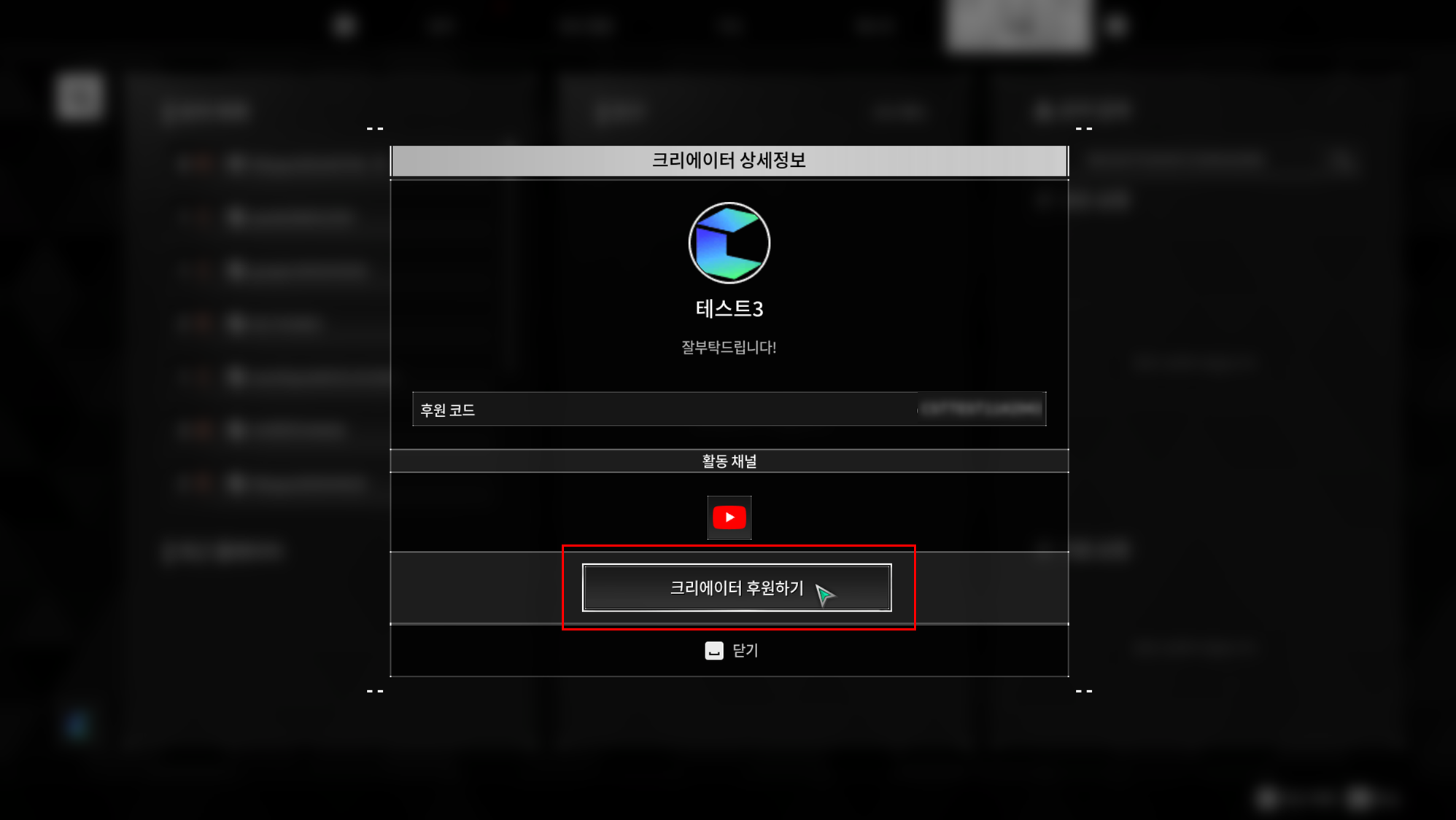 [게임 접속] → [맵] → [소셜] → [유저 검색창] → [크리에이터 게임ID 입력] → [크리에이터 정보 확인] → [후원 등록하기 버튼 클릭]