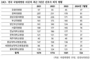 https://www.gnnews24.kr/news/articleView.html?idxno=25505경상국립대병원, 간호사 3년간 565명 사표... 국립대 중 두 번째[경남뉴스 | 권연수 기자] 경상국립대병원 간호사가 최근 3년간 평균 188명이 퇴사하는 것으로 나타나 의료 인력의 심각한 공백 우려가 커지고 있다. 이는 전국 10개 국립대 병원 중 두 번째 많은 수준이다.6일 강경숙 국회의원(국회 교육위원회 조국혁신당 원내부대표)실이 전국 10개 www.gnnews24.kr