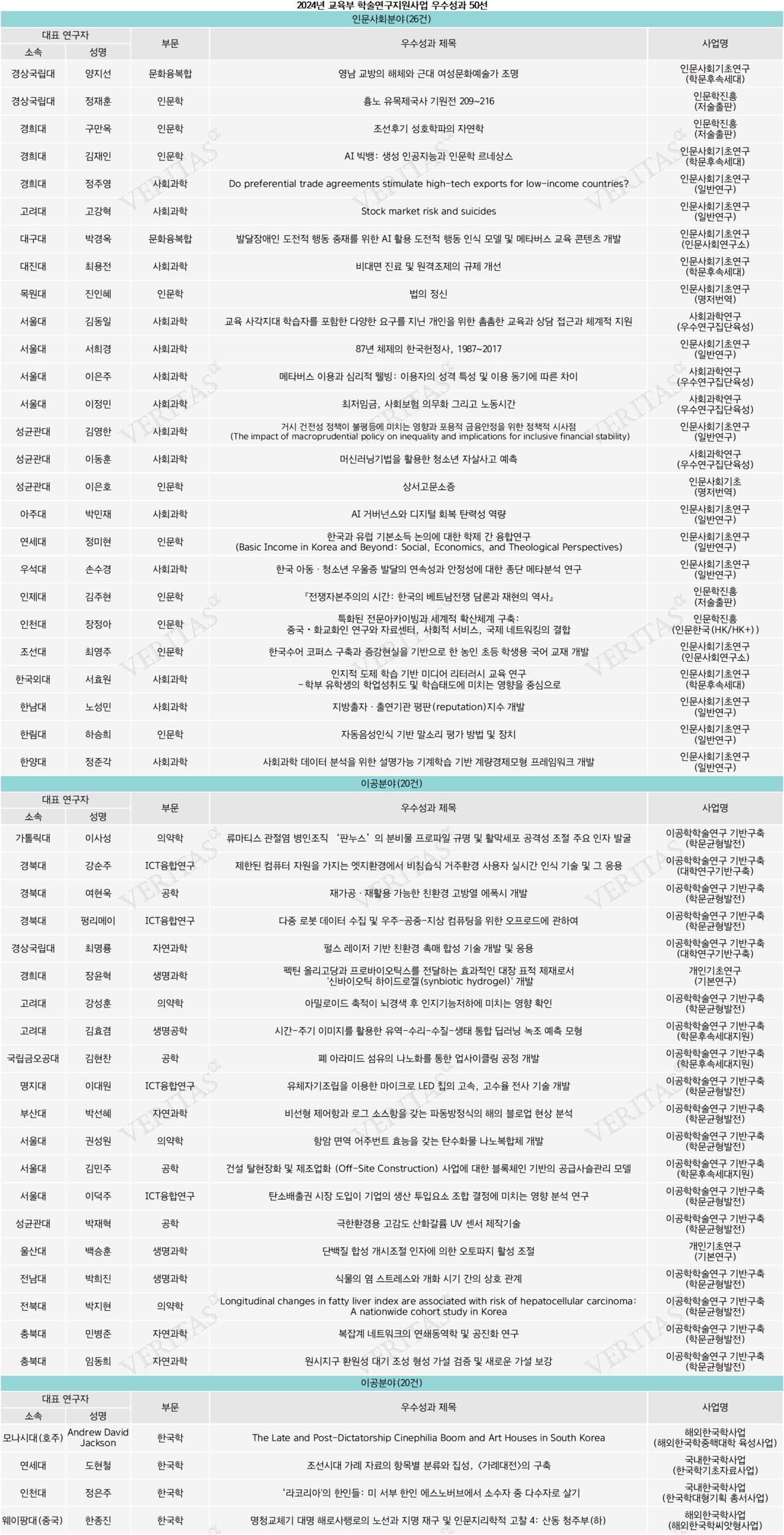 2024 학술연구지원 우수성과 50선.. 서울대(7건) ‘최다’ 성대 경희대(각 4건) 톱3 < 정부지원사업 < 대입잣대 < 대입 < 기사본문 - 베리타스알파