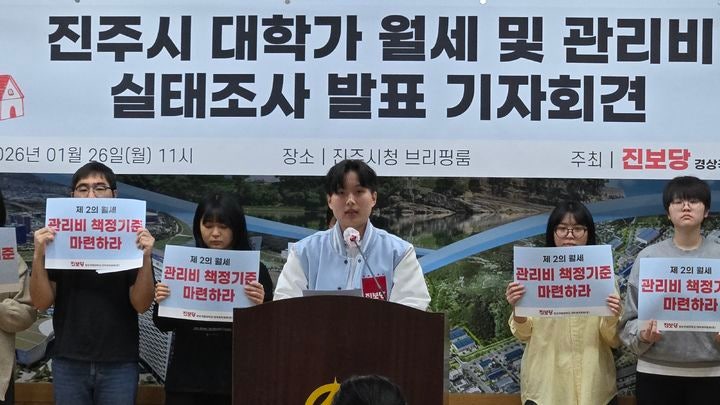https://n.news.naver.com/article/003/0013730612?sid=102경상국립대 대학생 "진주시에 대학가 월세폭등 대책마련 촉구"진보당 경상국립대학교 대학생위원회 준비위원회는 26일 진주시청 브리핑룸에서 기자회견을 열고 "최근 대학가 주변 주거비용이 비싸 대학생이 생활할수 없을 정도로 심각하다"며 "진주시는 대학가 월세 폭등 대책을 마련하라"n.news.naver.com
