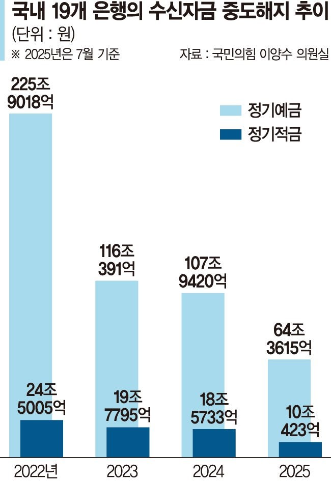 https://n.news.naver.com/mnews/article/014/0005399945?sid=101내수침체 장기화에 올 예적금 중도해지 74조 올해 들어 7월까지 개인 및 개인사업자가 국내 은행 19곳에서 정기예·적금을 중도해지한 금액이 74조원을 넘는 것으로 나타났다. 금리 상승기이자 코로나19가 절정에 달했던 지난 2022년 정점을 찍은 정기예·적금 중n.news.naver.com최근 2년 해약 줄어들다 증가조짐이자 못받더라도 돈 필요하단 뜻