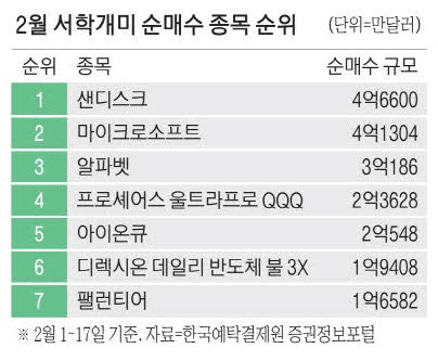 https://n.news.naver.com/article/009/0005638277?sid=101기술주 상승 베팅한 서학개미 … 샌디스크 이달 4.6억달러 '집중매수'MS·알파벳 등 빅테크에 뭉칫돈 필라델피아 반도체지수 3배 추종 레버리지 ETF상품도 '공격 매수' 최근 미국 증권시장에서 기술주들이 조정을 받으며 변동성이 커진 가운데, 해외 주식에 투자하는 국내 투자자(서학개미)n.news.naver.com