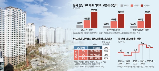 https://n.news.naver.com/article/011/0004591915?sid=101종부세 7% 넘기면 ‘버티기’ 흔들…강남 다주택자 손익 계산해보니[Pick코노미]종합부동산세 최고세율을 현행 5%에서 9% 이상으로 올려야 강남 초고가 다주택자의 ‘버티기’ 전략이 흔들릴 것이라는 분석이 나왔다. 21일 서울경제신문이 현직 세무사들에게 의뢰해 대표 단지를 기준으로 시뮬레이션한 결n.news.naver.com
