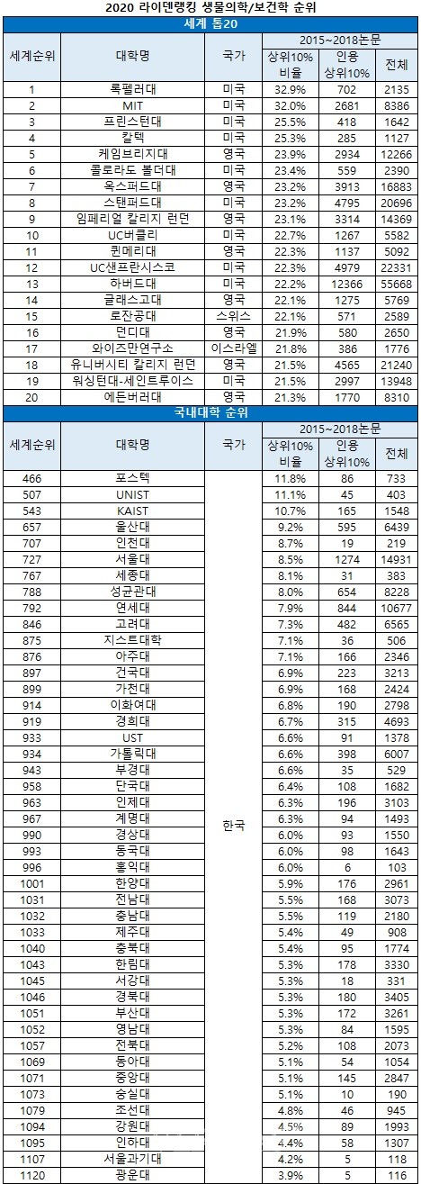 세계톱20에서는 록펠러대가 MIT를 제치고 톱을 기록했다. 상위10%논문 비율은 32.9%였다.