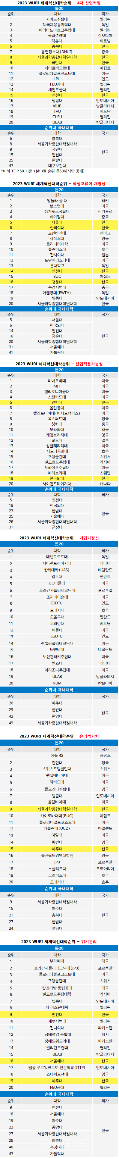 2023WURI세계혁신대학순위 종합 톱100을 살펴보면 서울대가 세계17위에 올라 국내 톱을 기록했다. 지난해 16위에서 한 계단 하락했지만 톱을 유지했다. 인천대가 세계18위로 바짝 다가왔다. 지난해 21위에서 3계단 상승했다. 세계32위의 한국외대까지 지난해와 동일한 톱3다. 이어 서울과학종합대학원대학(58위) 한밭대(60위) 충북대(65위) 청운대(73위) 서울예대(85위) 아주대(87위) 루터대(91위)의 10개교가 세계100위에 이름을 올렸다. 이번 평가에서는 100대 대학 사례 외에도 훌륭한 혁신 사례가 많이 발굴돼서 101~200위, 201~300위도 구간 내에서 등수 없이 발표했다. 세계101-200위에는 중앙대 한양대 가톨릭대 국민대 군장대 삼성디자인교육원이 이름을 올렸으며 201-300위에는 성균관대 숙명여대 대구보건대 대구한의대가 이름을 올렸다. 가톨릭대 대구보건대 대구한의대가 순위에 새롭게 진입한 변화가 있다. 특히 순위에 오른 20개교 중 11개교는 순위가 상승했다. 하락한 곳은 2곳 뿐이었으며 그 외 대학은 순위를 굳혔다.