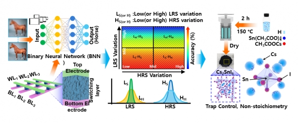 인천대 진성훈교수 공동연구팀은 차세대 메모리 기술로 주목받는 세슘주석요오드 Cs2SnI6 (CSI) 기반의 저항변화 메모리(RRAM) 소자가 이진 신경망(Binary Neural Network, BNN)의 응용에서 탁월한 가능성을 보여줌을 밝혔다.