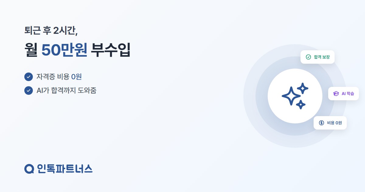 https://www.intalkpartners.com인톡 파트너스 | AI와 함께하는 보험설계사 자격 취득 부업으로 보험설계사 어때요? 자격증 취득 비용 0원, AI 학습으로 빠르게 합격. 합격하면 리워드 포인트까지. 월 50만원 부수입의 시작.www.intalkpartners.com이런 사이트에서 신청하면 자격증 따고 바로 돈 벌 수 있는건가??