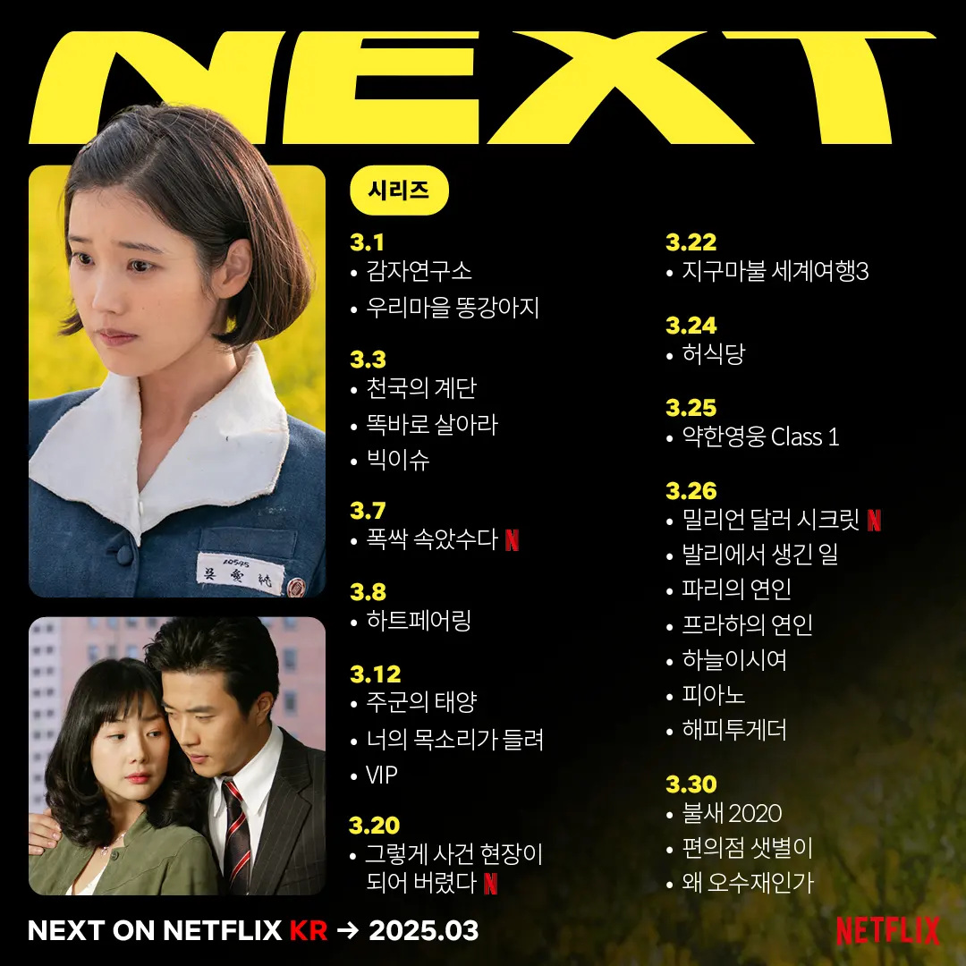 https://x.com/netflixkr/status/1894945551155646795?s=46봄바람 타고 도착한 3월 넷플릭스 신작🌸🌬️ pic.twitter.com/MlYUVUhClE— Netflix Korea|넷플릭스 코리아 (@NetflixKR) February 27, 2025 https://www.instagram.com/p/DGj3XnZqmrYhttp://youtube.com/post/UgkxRgtNhM8QPg8S0eilso9yr0ykHRg6Cw7l?feature=sharedNetflix Korea 넷플릭스 코리아님의 게시물봄바람 타고 도착한 3월 넷플릭스 신작??+youtube.com