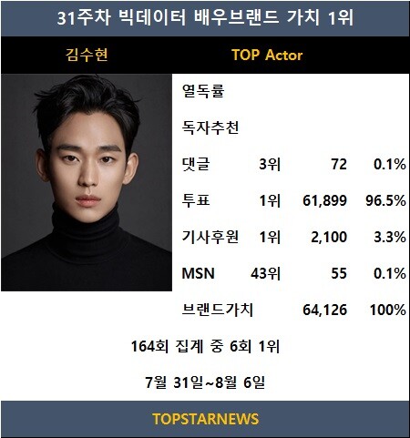 배우 김수현이 31주차 빅데이터 배우 브랜드 종합 순위에서 다시 한 번 1위 자리를 지켜내며, 명실상부한 ‘브랜드 파워의 절대강자’임을 입증했다.