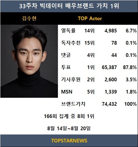 https://www.topstarnews.net/news/articleView.html?idxno=15777866김수현, 33주차 빅데이터 배우 브랜드 1위…윤아·김혜윤 TOP3, 브랜드가치 급등 스타 속출이번 33주차 빅데이터 배우 브랜드 종합 순위에서 김수현이 다시 한 번 정상의 자리를 지켰다. 그는 3건의 주요 보도와 함께 열독률 4,985점, 독자추천 78점, 기사댓글 44점, MSN 좋아요 1,339점, 슈퍼스타브랜드파워투표 65,387점, 기사후원 2,600점www.topstarnews.net - dc official App