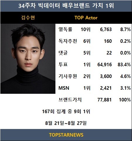 https://www.topstarnews.net/news/articleView.html?idxno=15786462김수현, 34주차 빅데이터 배우 브랜드 종합 1위…윤아·변우석 TOP3, 급상승 스타는 박은빈·마동석34주차 빅데이터 배우 브랜드 종합 순위에서 김수현이 다시 한 번 정상의 자리를 지켜냈다. 그는 열독률, 독자추천, 기사댓글, MSN 좋아요, 투표, 기사후원, 써클차트, 뮤지션100 등 8개 주요 지표에서 고른 성적을 거두며 총점 77,881점을 기록해 압도적인 1위www.topstarnews.net