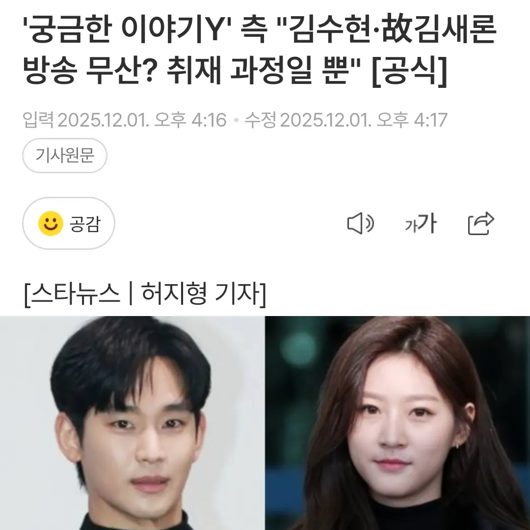 출처는 http://youtube.com/post/UgkxzyC21o3nYg_fO5enaSSWsLY5qzvJDaTK?si=Box5s36kgvh09jDl진격의고변 進撃の高弁 / Korean Legal Titan님의 게시물SBS에서 입장 내셨네요. 스포츠경향 이선명 기자님, 고상록 변호사든 SBS든 입장 들어보고 기사 쓰실 수는 없었습니까? 그렇게 급하셨습니까? https://naver.me/G1mkc6j7youtube.comhttps://naver.me/5asnM6o4'궁금한 이야기Y' 측 "김수현·故김새론 방송 무산? 취재 과정일 뿐" [공식]'궁금한 이야기Y' 측 "김수현·故김새론 방송 무산? 취재 과정일 뿐" [공식]naver.me
