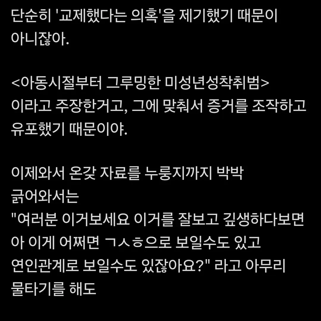 출처는 http://youtube.com/post/UgkxyHAZhXs1TuPfVke0jvGsYs6vskZp9fcf?si=aSv3q4BKZP1Pttno진격의고변 進撃の高弁 / Korean Legal Titan님의 게시물[사건의 본질 - 왜 5가지 핵심질문인가?] 아무래도 배우와 함께 오랜시간 고통받아온 팬분들의 분노가 담겨 있어 표현이 조금 과격합니다만, 이것이 사건의 본질인 것은 맞습니다. (첨부 사진들) 1. 이 사건은 단순히 미성년 시절 교제 의혹을 제기한 사안이 아닙니다. 만일 그랬다면 ...youtube.com