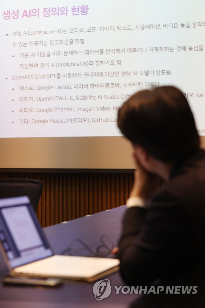 '생성 AI에서 윤리 이슈' (서울=연합뉴스) 강민지 기자 = 28일 오전 서울 서초구 더케이호텔에서 생성 인공지능(AI)과 분야별 AI 윤리법제 이슈를 주제로 '인공지능 윤리법제 포럼' 창립 웨비나가 열리고 있다. 사진은 대화형 챗봇 '이루다'를 만든 스캐터랩 하주영 변호사의 '생성 AI에서 윤리 이슈'에 대한 발표를 듣는 참석자. 2023.2.28 mjkang@yna.co.kr▶제보는 카톡 okjebo