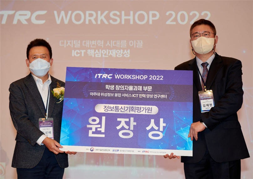 아주대 위성정보 융합 서비스 ICT 인력 양성 연구센터는 참여 학생(한상민)과 지도교수(김재현)이 2022 ITRC 워크숍에서 IITP 원장상을 수상하는 성과를 거뒀다.아주대 위성정보 융합 서비스 ICT 인력양성 연구센터도 인재양성대전에 참여한다. 수요자 맞춤형 위성정보 활용 ICT 융합 인재 양성을 목표로 둔 이곳은 다목적 위성 상용화와 위성정보 생성, 처리, 활용 연구를 진행 중이다.