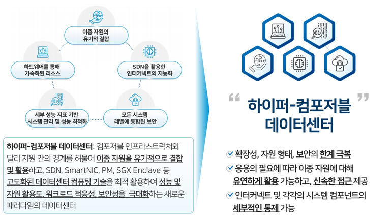 하이퍼 컴포저블 데이터센터 개요울산과학기술원(UNIST) 하이퍼-컴포저블 데이터센터 연구센터도 인재양성대전에 참여해 성과를 보인다. 이곳은 성능과 자원 활용도, 보안성 등을 극대화한 '하이퍼-컴포저블 데이터센터'를 위한 연구개발(R&D)을 진행 중이다, 이를 위한 시스템 SW를 연구하고 관련 고급인력 양성도 한다. 이번에는 컴퓨팅, 메모리, 스토리지, 네트워크 자원관리 시스템 SW 기술을 선보인다.