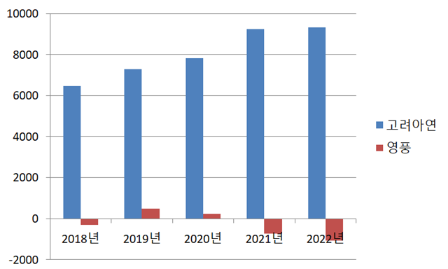 반면 영풍은 2018년 300억원 영업적자, 2019년 500억원 영업이익, 2021년 728억원의 영업적자, 2022년 1078억원의 적자를 기록했다. 영풍은 지난해 1~3분기까지 536억원 적자를 보이며 연간 영업이익도 적자가 예상되고 있다.