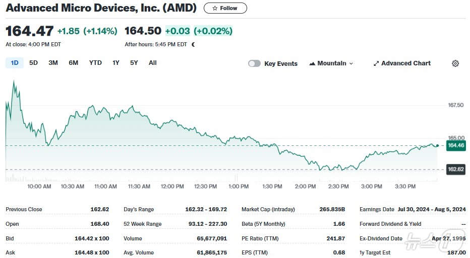 이같은 소식으로 엔비디아는 2% 정도 급락한 데 비해 AMD는 1% 이상 상승했다. 이날 AMD는 전거래일보다 1.14% 상승한 164.47달러로 장을 마감했다.