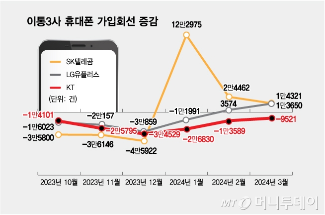 <img alt='이통3사 휴대폰 가입 회선 증감/그래픽=김다나' class='thumb_g_article' data-org-src='https://t1.daumcdn.net/news/202405/20/moneytoday/20240520225448792dggm.jpg' data-org-width='654' dmcf-mid='F6E8KF8tqX' dmcf-mtype='image' height='auto' src='https://img1.daumcdn.net/thumb/R658x0.q70/?fname=https://t1.daumcdn.net/news/202405/20/moneytoday/20240520225448792dggm.jpg' width='658' style='display: block; width: 601.69px; margin: 0px auto; vertical-align: top;'>이미지 크게 보기