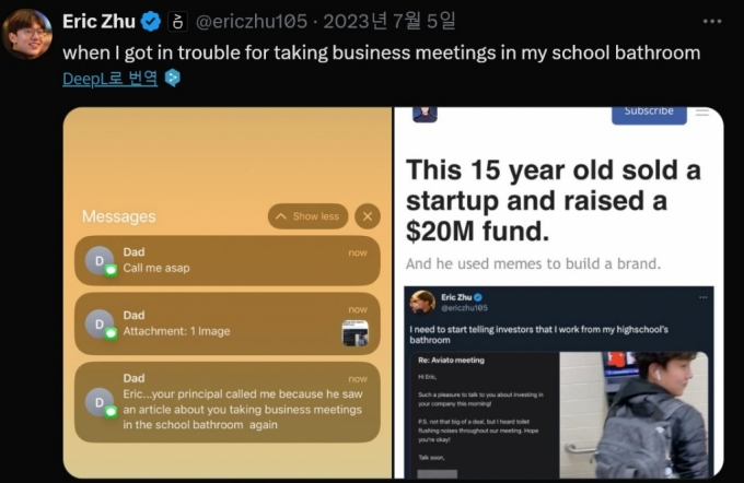 <img src='https://thumb.mt.co.kr/06/2024/08/2024080211123047498_5.jpg/dims/optimize/' alt='고교생 창업가 에릭 주가 자신이 학교 화장실서 사업회의를 한 사실이 알려지자 교장에게서 주의를 받았다고 공개한 아버지의 문자/사진=소셜미디어 X' style='border-width: initial; vertical-align: middle; min-width: 340px; max-width: 680px;'>고교생 창업가 에릭 주가 자신이 학교 화장실서 사업회의를 한 사실이 알려지자 교장에게서 주의를 받았다고 공개한 아버지의 문자/사진=소셜미디어 X스티브 잡스 등 미국에선 주택의 '차고'에서 창업한 유명인들이 적잖다. 자신이 다니던 고등학교 화장실을 창업공간으로 썼다면 어떨까.