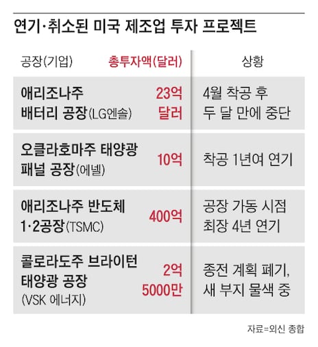 하지만 최근 이 같은 계획이 줄줄이 지연되면서 바이든 대통령의 제조업 육성 정책에 의문을 제기하는 목소리가 커지고 있다. 한국의 LG에너지솔루션은 미국 애리조나주에 23억달러(약 3조1500억원)를 들여 에너지 저장 장치(ESS) 배터리 전용 생산 공장을 짓기로 했다가 착공 두 달 만인 지난 6월 일시 중단했다. LG에너지솔루션과 제너럴모터스(GM)의 합작법인 얼티엄셀즈가 26억달러(약 3조5600억원)를 들여 미시간주에 짓고 있는 전기차 배터리 3공장 건설도 일시 중단됐다. 제조업체 관계자는 “전기차·배터리 캐즘(일시적 수요 정체) 등 경기 회복 속도가 예상보다 더딘 데다가 임금 인상과 글로벌 공급망 문제로 건설 비용이 급증한 영향을 받은 것”이라고 했다.