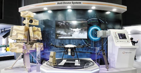 한화시스템이 지난해 부산 벡스코에서 열린 MADEX(국제해양방위산업전)에 참가해 소형 무인기를 타격하는 ‘드론 복합 방호 체계’를 전시하고 있다. /한화시스템 제공