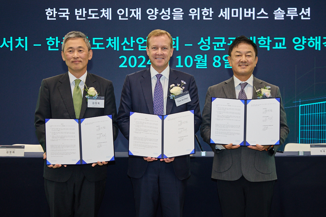 <img alt='김정회(왼쪽부터) 한국반도체산업협회 부회장과 팀 아처 램리서치 회장 겸 CEO, 최재붕 성균관대 부총장이 8일 경기도 용인시 기흥구에서 열린 램리서치 용인 캠퍼스 개관식에서 한국 반도체 인재양성을 위한 양해각서를 체결하고 기념촬영하고 있다. [램리서치 제공]' class='thumb_g_article' data-org-src='https://t1.daumcdn.net/news/202410/09/ned/20241009134840129wxba.jpg' data-org-width='1136' dmcf-mid='7YCq1zuSUY' dmcf-mtype='image' height='auto' src='https://img2.daumcdn.net/thumb/R658x0.q70/?fname=https://t1.daumcdn.net/news/202410/09/ned/20241009134840129wxba.jpg' width='658' style='display: block; width: 601.69px; margin: 0px auto; vertical-align: top;'>이미지 크게 보기