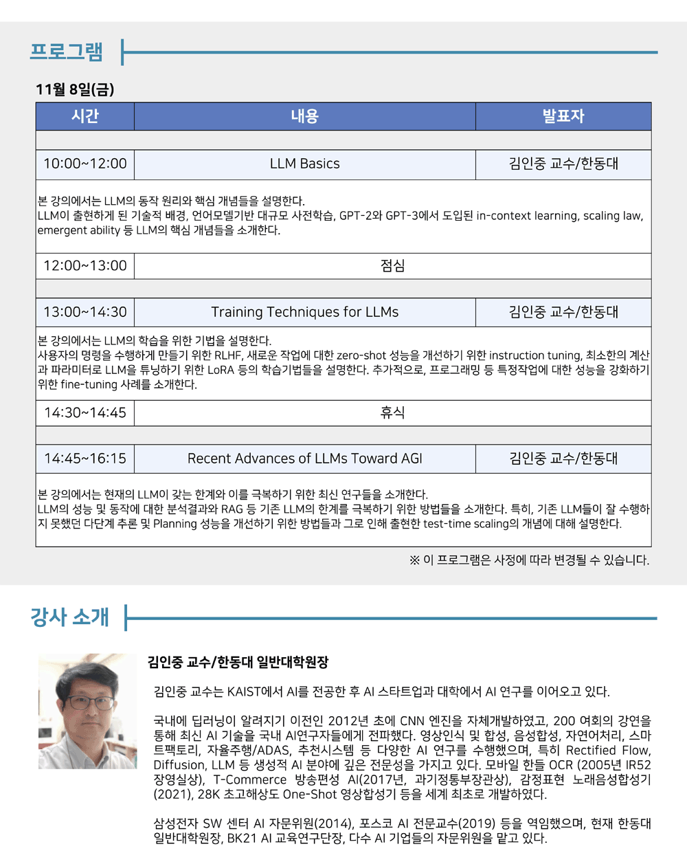 <img src='https://www.kw.ac.kr/KWData/webeditor/2024/2024_10_08_111129.gif' alt='프로그램10:00~12:00LLM Basics(김인중교수)본 강의에서는 LLM의 동작 원리와 핵심 개념들을 설명한다. LLM이 출현하게 된 기술적 배경, 언어모델기반 대규모 사전학습, GPR-2와 GPT-3에서 도입된 in-context learning, scaling law, emergent ability 등 LLM의 핵심 개념들을 소개한다.12:00~13:00 점심시간13:00~14:30 Training Techniques for LLMs(김인중교수/한동대)본 강의에서는 LLM의 학습을 위한 기법을 설명한다.사용자의 명령을 수행하게 만들기 위한 RLHF, 새로운 작업에 대한 zero-shot 성능을 개선하기 위한 instruction tuning, 최소한의 계산과 파라미터로 LLM을 튜닝하기 위한 LoRA 등의 학습 기법들을 설명한다. 추가적으로, 프로그래밍 등 특정작업에 대한 성능을 강화하기 위한 fine-tuning사례를 소개한다.14:30~14:45 gbtlr14:45~16:15 Recent Advanced of LLMs Toward AGI(김인중교수/한동대)본 강의에서는 현재의 LLM이 갖는 한계와 이를 극복하기 위한 최신 연구들을 소개한다. LLM의 성능 및 동작에 대한 분석결과와 RAG 등 기존 LLM의 한계를 극복하기 위한 방법들을 소개한다. 특히, 기존 LLM들이 잘 수행하지 못했던 다단계 추론 및 Planning 성능을 개선하기 위한 방법들과 그로 인해 출현한 test-time scaling의 개념에 대해 설명한다.※이 프로그램은 사정에 따라 변동될 수 있습니다.' style='list-style-type: none; margin: 0px; padding: 0px; text-size-adjust: none; border-style: initial; vertical-align: top; max-width: 100%; width: auto;'>