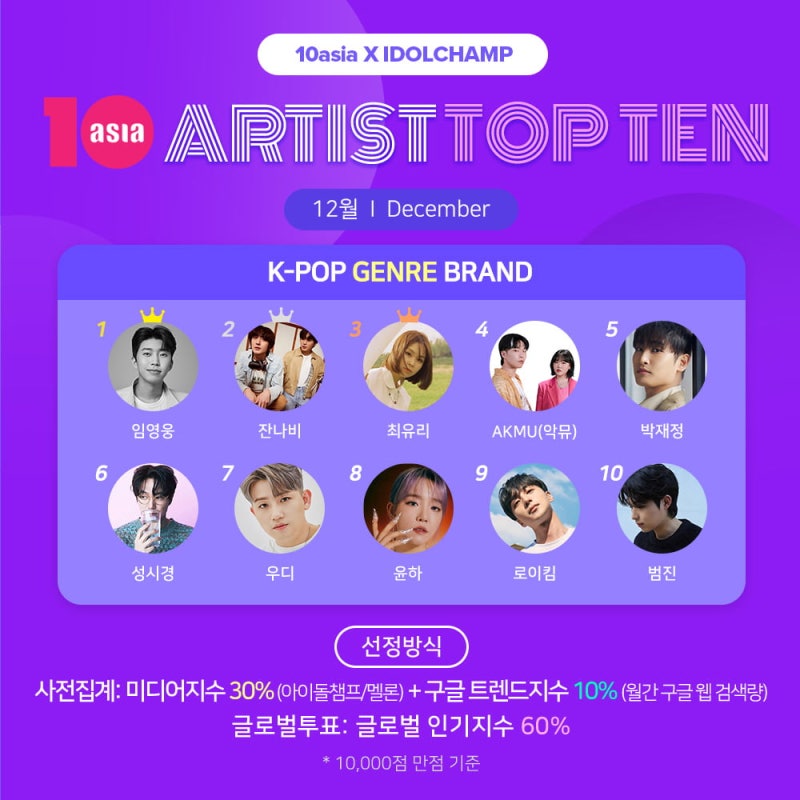 https://naver.me/xSNRFz3m임영웅·잔나비·최유리, 12월 '아티스트탑텐 K-팝 장르 브랜드' 선정임영웅, 잔나비, 최유리, AKMU(악뮤), 박재정, 성시경, 우디, 윤하, 로이킴, 범진이 텐아시아 아티스트탑텐(TENASIA ARTIST TOP TEN) 12월 'K팝 장르 브랜드(K-POP GENRE BRANDnaver.meㅊㅋㅊㅋ