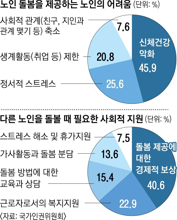https://n.news.naver.com/article/081/0002993642치매 아내 10년 ‘노노 돌봄’ 끝내 살인 부른 ‘독박 돌봄’[서울신문] 치매 70%·인지 저하 56%, 가족이 수발 돌봄책임, 배우자>자녀>지역사회 꼽아 돌보는 노인도 신체·정서·경제적 부담 노령화 2060년 4배… 돌봄 문제 가속화 삶의 질 고려해 ‘사회적 돌봄’ 분담을1n.news.naver.com