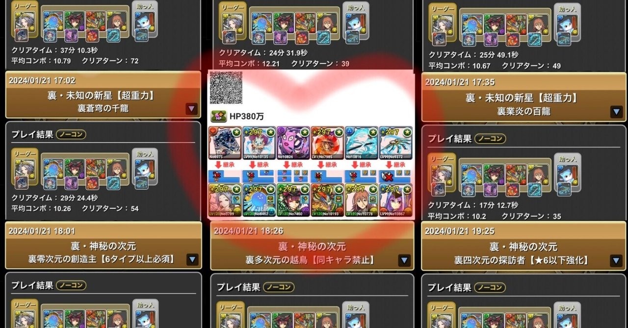 우억조, 우흉조, 우만수, 우천수, 우백식, 우영차원, 우다차원, 우사차원, 우기구성, 우마랑, 도황과괴명(강성), ex투기장, 11월ex, 12월ex 총 14던전을 완전 동일 편성으로 클리어 ㄷㄷ