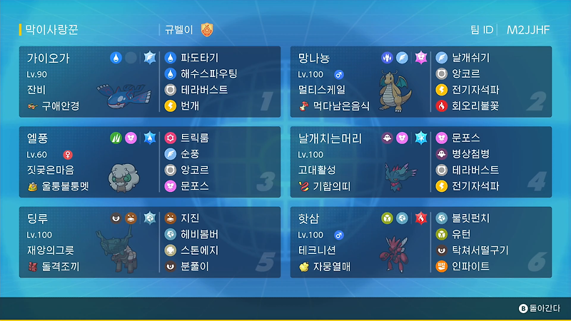 https://gyubell.tistory.com/10레귤레이션G 비트다운 가이오가 팀 소개조정의도: 순풍 후 최속 흑버드렉스를 추월합니다. 파티의 축이되는 포켓몬입니다. 보통은 이런류면 물테라가 맞지않나? 생각하실수도 있지만, 현재 가이오가 자체가 저평가되는 요인인 코라이돈, 혹은 물거폰으로 막으려는 시도를 차단할 비행테라버스트를 채용해놓고 있습니다.테라가 없는 해수스도 아쉬운 순간이 아이에 없었다면 거짓말이겠지만, 그럼에도 무보정 블랙큐레무를 약 7할로 확정으로 잡아내는 데미지를 뽑아내기에 만족하면서 썼네요. 조정의도B: 매직넘버C: 문포스+울멧피격1회로 무보정 파오젠을 확정HD: 풀보정 가이오가의 해수스파우팅 확정2타 비트다운의 시발점 겸 랭크업 스토퍼를 겸하는 우수한 페어리타입. 특히 가이오가가 불러오는 물거폰에 후내밀기가 가능하다는 것이 너무나도 좋았던 친구입니다. 이번 룰 초반부에..gyubell.tistory.com많은관심과 사랑가이오가 이거 싱글에서도 좋은 포켓몬이다..