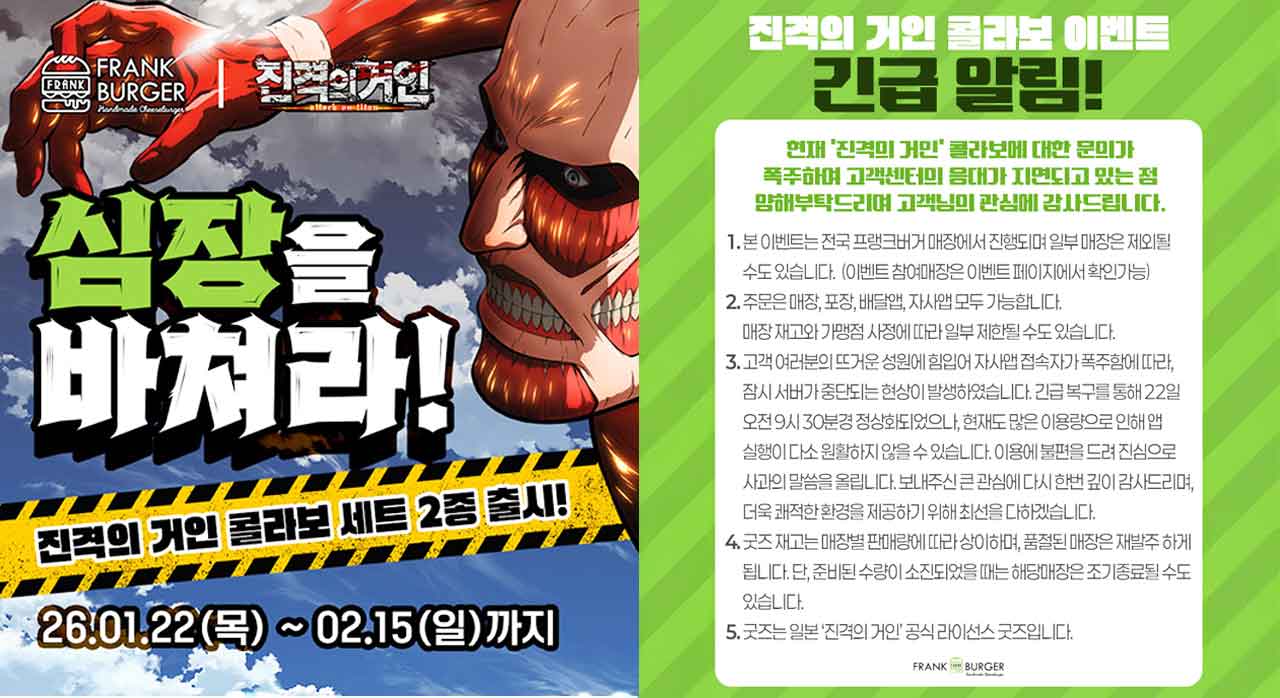 https://www.thetrippick.com/news/articleView.html?idxno=2635“진격거 팬들 난리났네” 프랭크버거 X 진격의 거인 콜라보, 출시하자마자 ‘오픈런·품절 대란’ - 여행픽 프랭크버거가 애니메이션 ‘진격의 거인’과 손잡고 팬심을 제대로 저격하는 콜라보 세트를 선보였습니다. 2026년 1월 22일부터 2월 15일까지 진행되는 이번 콜라www.thetrippick.com프랭크버거가 진격의 거인과 콜라보했는데, 햄버거보다 굿즈 때문에 난리 난 상황임.