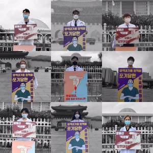 http://www.bosa.co.kr/news/articleView.html?idxno=2131832‘의대정원 확대 반대’ 의대생들 릴레이 시위 나서[의학신문·일간보사=김현기 기자] 대한의과대학·의학전문대학원 학생협회(이하 의대협) 이사진들이 최근 국회와 광화문 앞에서 정부가 추진 중인 의대 정원 확대 정책을 저지하고자 릴레이 1인 시위를 벌였다. 우선 광화문에서 시위를 진행한 의대협 김재의 부회장은 "현재 당정이 밀어붙이고 있는 정책들과 법률안들은 공공의료 종사자를 꿈꾸는 많은 의대생들에겐 마른하늘에 날벼락"이라며, "안 그래도 국가로부터 버림받아 불모지 수준이 돼버린 공공의료 분야를 국가가 살려내긴커녕 오히려 방화를 하는 꼴"이라고 비판했다. 이어 그는 "공공의료www.bosa.co.kr미래에 또 정권 바뀌고 건수 하나 잡으면 슬금슬금 기어나와서 활동하겠지?ㅋㅋ