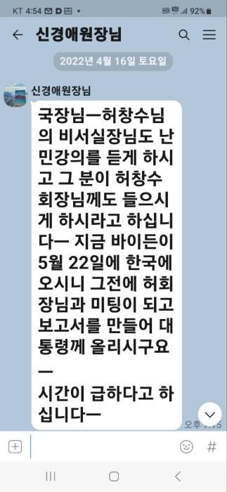 윤석열 대통령 당선 이후에도 윤 대통령 측과 무속인 천공(본명 이천공) 측의 교류가 있었다는 정황을 <뉴스토마토>가 단독 입수했습니다. 윤 대통령이 당선인 신분이던 2022년 4월16일, 천공의 최측근 신경애 정법시대문화재단 이사장이 당시 정법시대 법무팀장 A씨에게 보낸 카카오톡 메시지입니다. 2022년 4월16일 신경애 정법시대문화재단 이사장이 당시 정법시대 법무팀장 A씨에게 발송한 카카오톡 메시지를 <뉴스토마토>가 단독 입수했습니다. (사진뉴스토마토) 메시지 내용은 다음과 같습니다. 국장님ㅡ허창수님의 비서실장님도 난민 강의를 듣게 하시고, 그 분이 허창수 회장님께도 들으시게 하시라고 하십니다ㅡ 지금 바이든이 5월22일에 한국에 오시니 그전에 허 회장님과 미팅이 되고, 보고서를 만들어 대통령께 올리시구요ㅡ 시간이 급하다고 하십니다ㅡ 이 메시지를 보낸 신 이사장은 천공이 1등 제자라고 소개할 정도의 핵심 측근입니다. 20대 대통령 취임식에도 초청됐습니다. 천공과는 20년 넘게 긴밀한 관계를 이어왔으며, 천공의 모든 일정과 대내외 전략 등을 관리하는 것으로 파악됐습니다. 내부에서는 신 이사장을 신 원장으로 지칭합니다. 해당 메시지와 관련해 전 법무팀장 A씨는 바이든 미국 대통령이 곧 방한을 하는데 그 전에 대통령실에 천공의 기획안을 보고해야 하니, 허창수 회장과의 사전 만남이 필요하다는 지시였다고 설명했습니다. 또 허 회장 측에 밀봉된 문건도 전달했다고 했습니다. 메시지에 적힌 대통령께 올리시구요는 대통령께 올리려고요를 잘못 적은 것으로 보인다고 했습니다. 그는 저 메시지대로라면 나에게 허창수 회장과 미팅을 한 뒤 보고서를 만들어 대통령께 제출하라는 의미가 되는데, 내겐 (대통령께 보고할)그 정도의 능력은 없다고 했습니다. A씨 주장이 사실일 경우 윤석열 대통령 당선 이후에도 윤 대통령 측과 천공 측이 교류를 해왔다는 이야기가 됩니다. 더군다나 천공 측이 재계를 끌어들여 국정에도 개입하려던 것으로 읽힐 수밖에 없어, 박근혜 전 대통령을 파면시켰던 최순실 국정농단이 떠오른다는 지적에 직면할 수 있습니다. 윤 대통령은 국민의힘 대선 예비후보 시절이었던 2021년 10월5일과 11일 당 경선 TV토론회에서 유승민 후보의 거듭된 공세에, 부인 김건희 여사와 함께 천공을 몇 차례 만났다는 사실을 시인했습니다. 다만 최보식 칼럼을 통해 천공과의 관계가 문제가 된 이후에는 서로 연락하거나 만난 적이 없다고 했습니다. 대통령실 또한 그간 같은 입장이었습니다. 2021년 10월11일 진행된 국민의힘 대선 후보자 호남 합동 TV토론회에서 당시 유승민 후보가 정법(천공) 같은 헛소리를 하는 사람을 왜 만났는지를 묻자 윤석열 후보가 아니, 만날 수도 있는 거 아닙니까라고 답하고 있다.(사진엠빅뉴스 유튜브 영상 갈무리) 천공 측이 허창수 회장에게 제안하려 했던 난민 사업에 대해 A씨는 미국과 멕시코 국경지대에 대규모 난민촌을 조성하는 사업으로 알고 있다고 했습니다. 공교롭게도 신 이사장과 A씨가 긴밀히 움직였던 시기와 맞물려 천공은 난민 프로젝트를 집중적으로 말하기 시작합니다. 2022년 4월11일 천공은 유튜브 채널에 중남미 난민 제로 프로젝트라는 제목의 강의 영상 3개를 올립니다. 신 이사장은 이날 A씨에게 카카오톡으로 해당 영상 링크와 함께 국장님 들어보시고, 허창수 회장님과 인연이 닿는 분께도 들어보시게 하시면…이라는 내용의 메시지를 보냅니다. 총 33분 분량의 강의 내용을 정리하면, 대한민국 정부와 국내 기업들이 국제금융 약 300조를 끌어다 미국과 멕시코 접경지대에 특구를 지정, 공단을 조성하고 이곳에서 미국으로 들어오려는 중남미 국가의 난민들을 수용해 1차 소비재를 생산하게 하자는 겁니다. 300조 자금은 무이자로 20년 거치 30년 상환 계획으로 미국이 보증을 서야 하는데, 난민 사업이기 때문에 가능하다는 게 천공의 판단이었습니다. 2022년 4월11일 천공의 유튜브 채널(jungbub2013)에 업로드된 세 편의 중남미 난민 제로 프로젝트 강의 영상 중 첫 번째 영상. 천공이 난민 사업에 대해 설명하고 있다. (사진유튜브 영상 갈무리) 천공은 해당 계획을 대한민국 정부와 기업이 함께 미국에 제안하면, 난민 문제로 골치 아픈 미국은 좋아할 수밖에 없다고 봤습니다. 중국에 대한 미국의 수입 의존도 역시 크게 낮출 수 있어 G2 간 패권 경쟁에서도 유리한 고지를 선점할 수 있을 것으로 기대했습니다. 그러면서 특구만 조성되면 10~15년 뒤에는 저절로 경제가 일어날 것이니 한국 대기업들이 이런 국제 사업에 선제적으로 나서야 한다고 강조했습니다. 이 같은 내용의 보고서가 대통령실을 통해 바이든 미국 대통령 측에 전해졌다면 대한민국 외교에까지 천공이 개입한 것이 돼 정국은 일대 혼란을 겪게 될 것이 확실해 보입니다. 천공(맨 오른쪽)과 신경애(오른쪽에서 두번째) 정법시대문화재단 이사장이 2022년 9월 중순 미국 뉴욕 타임스퀘어에서 미국인 댄서의 공연을 보고 있다.(사진미국인 댄서 Dre의 틱톡(@der_da_dancer) 영상 갈무리) 천공은 윤석열 대통령이 UN총회 참석차 미국 뉴욕을 방문했던 9월20일(한국시각) 무렵 뉴욕