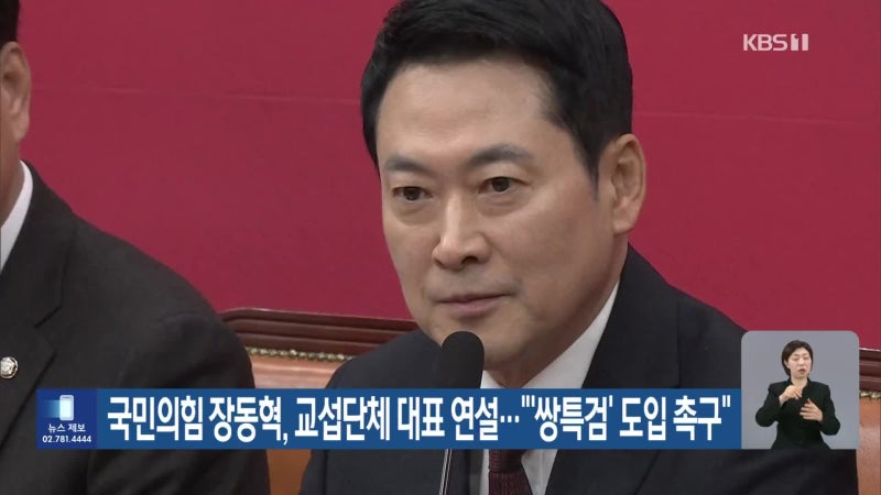 https://n.news.naver.com/article/056/0012118314?sid=100 국민의힘 장동혁, 교섭단체 대표 연설…“‘쌍특검’ 도입 촉구”국민의힘 장동혁 대표는 오늘 국회 본회의에서 '교섭단체 대표연설'에 나섭니다. 장 대표는 고환율과 고물가, 부동산 대책 등을 언급하며 정부를 비판할 것으로 보입니다. 또 민주당 공천헌금 의혹과 통일교 의혹 특검, 이n.news.naver.com