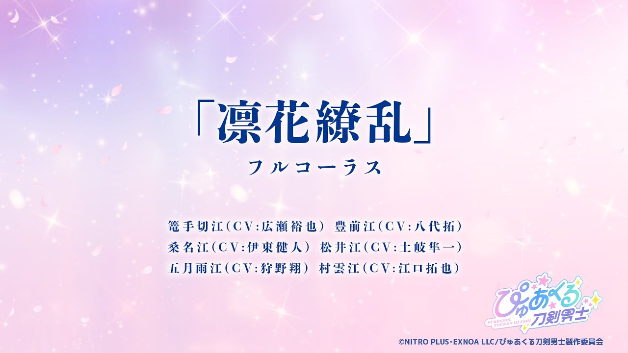 https://m.youtube.com/watch?v=Dp6Chcl0LCcぴゅあくる刀剣男士 「凛花繚乱」フルコーラス動画力強く咲く花のように凛々しく前進する姿を描いた楽曲「凛花繚乱」フルコーラス動画を公開いたしました!「ぴゅあくる刀剣男士」が彩る楽曲をどうぞ何度でもお楽しみください。凛花繚乱篭手切江(CV:広瀬裕也)、豊前江(CV:八代拓)、桑名江(CV:伊東健人)、松井江(CV:土岐隼一)、五月雨江(CV:狩野翔)、村雲江(CV...m.youtube.comhttps://m.youtube.com/watch?v=tPC1TBelme8ぴゅあくる刀剣男士 「I Believe」フルコーラス動画「テイスティング公演」開始を記念し、表題曲の「I Believe」フルコーラス動画を公開いたしました!「ぴゅあくる刀剣男士」が彩る素敵な楽曲をどうぞ何度でもお楽しみください。I Believe篭手切江(CV:広瀬裕也)、豊前江(CV:八代拓)、桑名江(CV:伊東健人)、松井江(CV:土岐隼一)、五月雨江(CV:狩...m.youtube.comhttps://m.youtube.com/watch?v=Iw3f7wTQdWAぴゅあくる刀剣男士 「GO&GO!!!」試聴動画「テイスティング公演」に先駆け、楽曲「GO&GO!!!」の試聴動画を公開いたしました!「ぴゅあくる刀剣男士」による新たな音楽をどうぞお楽しみください。「ぴゅあくる刀剣男士」は3D刀剣男士による「刀剣乱舞ONLINE」を原案としたバーチャル音楽ライブを中心とした新プロジェクト。SNSを起点としたインタラクティブな体...m.youtube.com노래는 무난무난하네+검색해보니 더 있어서 추가함