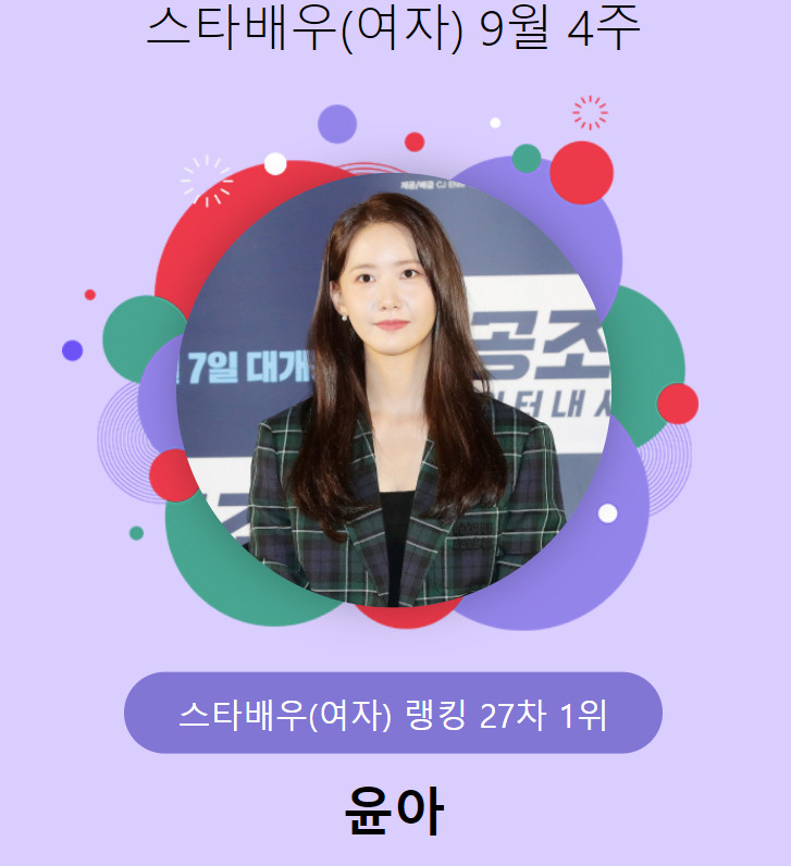 https://n.news.naver.com/article/108/0003184596?sid=106소녀시대 윤아, 2주 연속 스타랭킹 女배우 1위..압도적 표 차이그룹 소녀시대 멤버이자 배우 윤아가 스타랭킹 여자 배우 부문에서 1위를 차지했다. 윤아는 지난 9월 21일 오후 3시 1분부터 9월 28일 오후 3시까지 진행된 9월 4주(27차) 스타랭킹 스타배우 여자 랭킹 투표에n.news.naver.com좋아요 기사추천 누르자